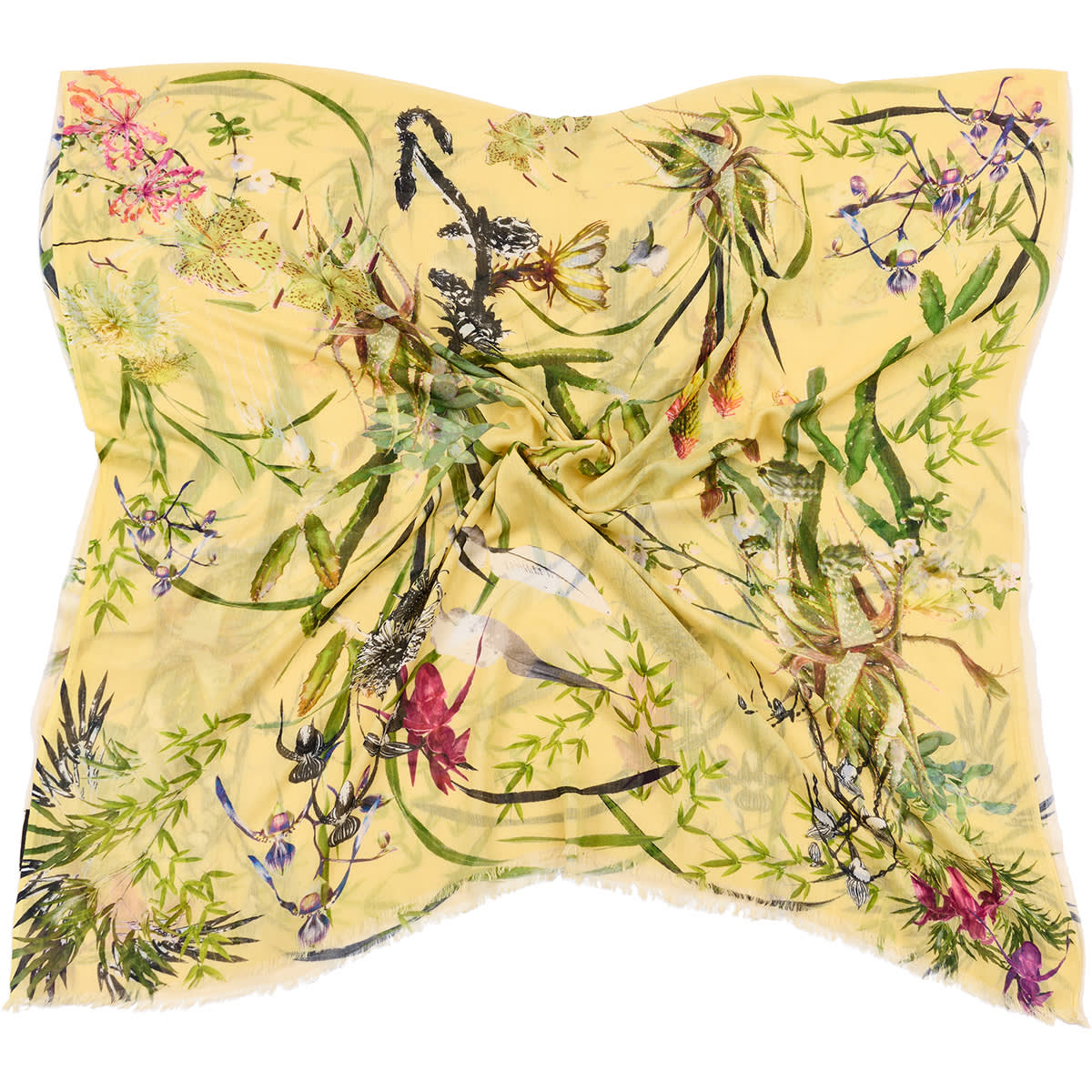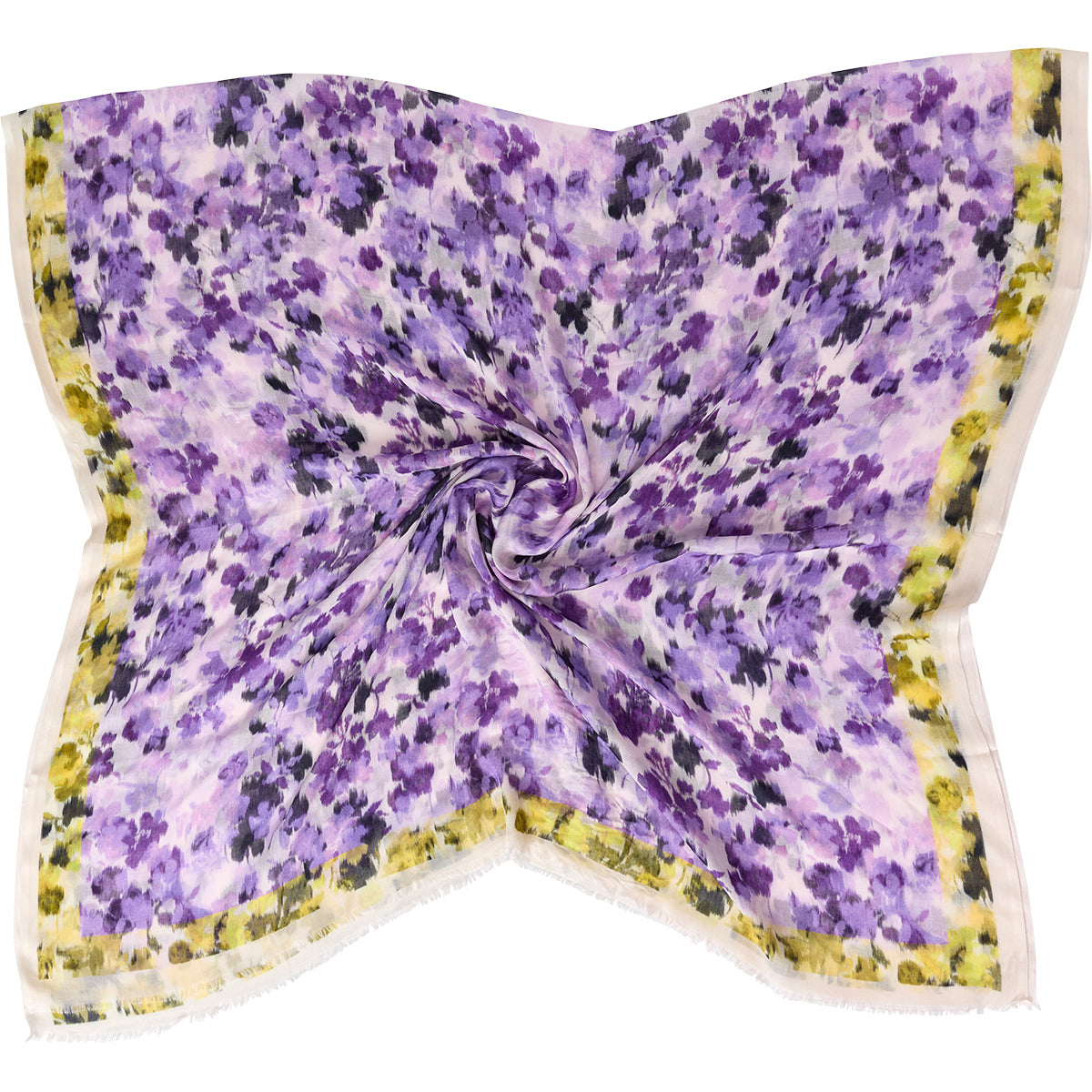 Kvadratisk tørklæde med grafisk mønster og ensfarvet kant.