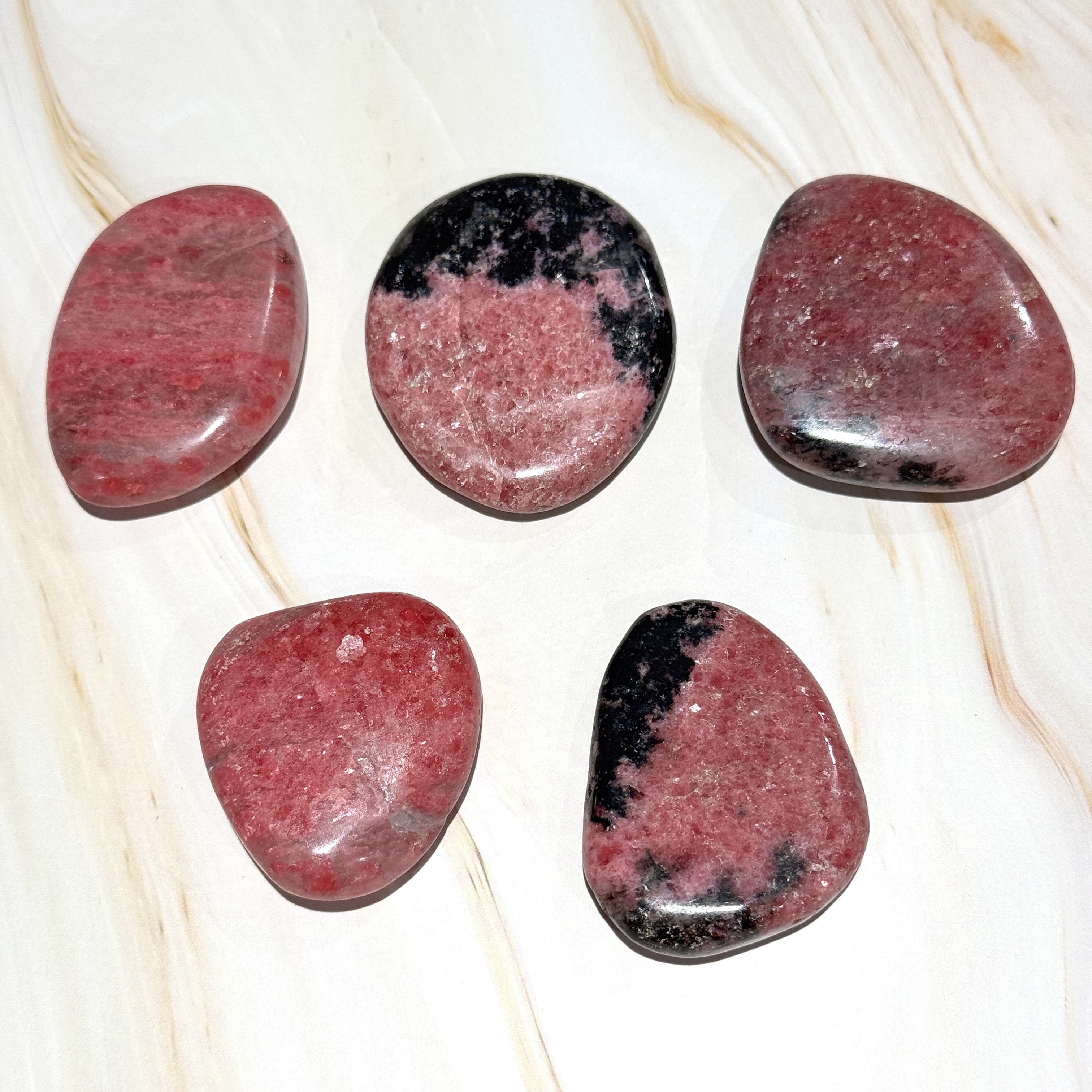 Disse smukke flade lommesten i rhodonit forener dybe rosa nuancer med sorte årer, der symboliserer både hjertets sår og dets styrke. Rhodonit er kendt som healingens og medfølelsens sten –
